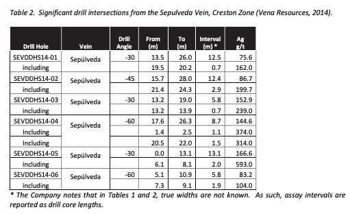 The main Esquilache vein system consists of 12 sub-parallel, sub-vertical, primary veins (>1.0 m width) found in the Mamacocha and Creston zones, along with more than 40 secondary veins (0.3 – 0.5 m width) occurring in vein swarms in dilatant structural settings. Two mineralized breccia bodies have been recognizedalongstructuraljogsintheElviraVeinlocatedintheMamacochaZone. Mineralizationinthese veinshasbeenshowntorangeconsistentlybetween3.0and12.0oz/tAg. Agold-richzonealsohasbeen recognized in the Mamacocha Zone with an average of 1.94 g/t Au, 138 g/t Ag, and 1% Zn from the Ivet Vein.